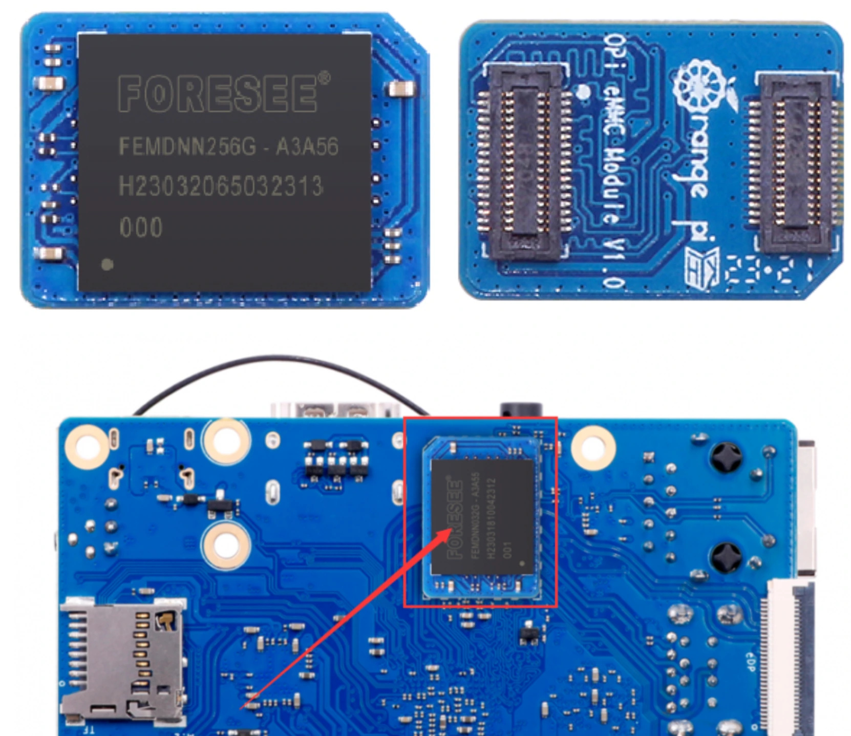 到货后按照官方文档所示,我迫不及待地把emmc插入开发板背面的扩展接口内,结果发现非常松,正当我怀疑这玩意“难道是焊上去的”之时,使劲一按发出清脆一响,就固定好了,居然是暴力出奇迹啊。