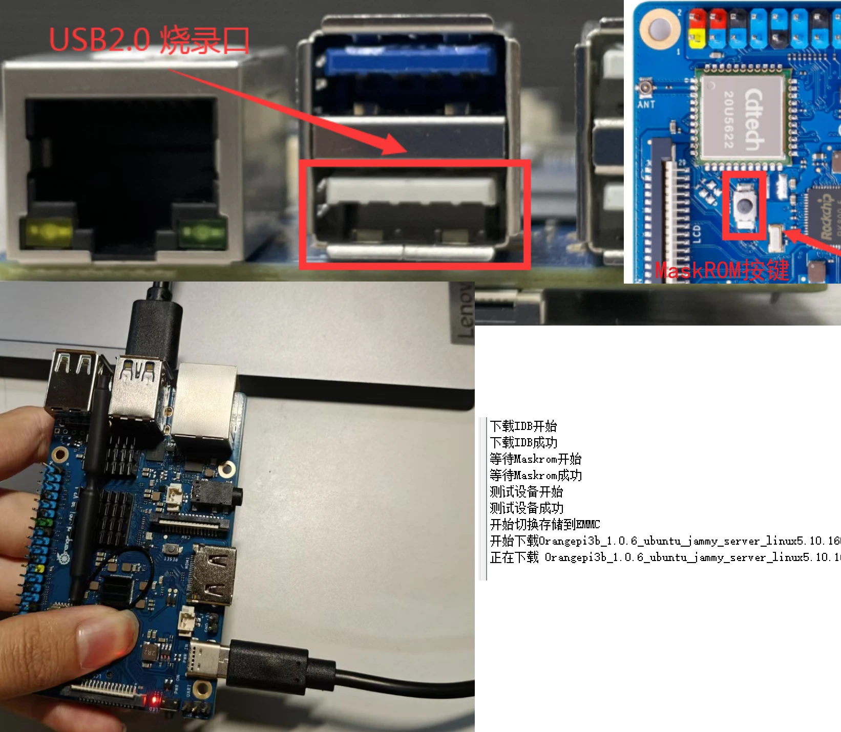 先下载瑞芯微驱动DriverAssitant_v5.12.zip并安装,通过USB2.0公对公数据线连接好开发板与Windows电脑,不用连接电源,然后按住开发板的MaskROM按键不放,再给开发板接上Type-C接口的电源,并上电,就可以松开MaskROM按键了。