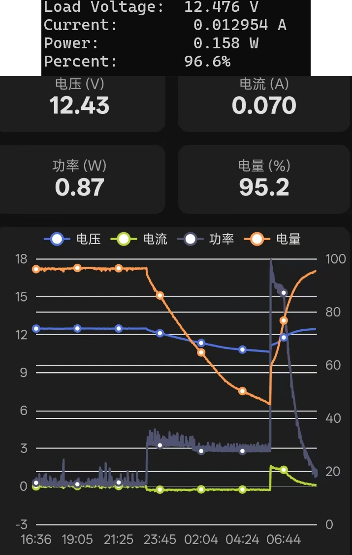 往后的某一天,我心血来潮,又想着用flask做了一个ups电量监测系统,每30s采集一次数据并存入数据库,用折线图可视化出来24小时的历史数据,效果还不错,如图就是某一天记录的完整充放电过程。